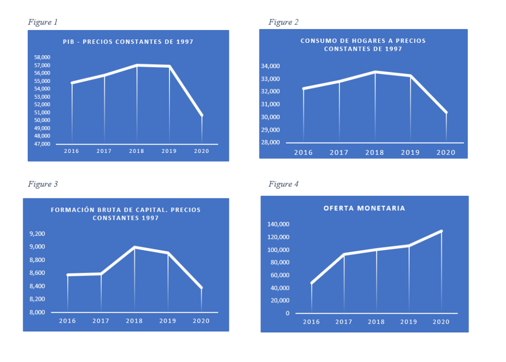 El 2020 fue un año de pobre desempeño en muchas áreas de la economía cubana. No voy a detenerme mucho en el 2020, solo lo necesario para que se comprenda que el 2021 fue el resultado de un prolongado proceso recesivo multicausal. Las figuras de la 1 a la 4 muestran la caída de indicadores seleccionados en 2020, aunque comenzó incluso antes de la pandemia. Ya desde el 2019, Cuba registró declives en indicadores como el PIB, el consumo de hogares y la formación bruta de capital. Indicadores todos que venían en desaceleración desde el 2017. Las causas son al menos dos, antes de que el COVID19 cerrara las economías mundiales: la crisis económica y política en Venezuela, que afectó el suministro de combustibles desde ese país hacia Cuba; y la llegada de la administración Trump a la Casa Blanca, que introdujo múltiples sanciones a Cuba, canceló los servicios consulares en ese país y redujo el número de vuelos de los Estados Unidos a la isla, -con evidente impacto sobre el turismo. El desempeño en el 2020 muestra la acumulación y convergencia de los elementos externos, la crisis del covid19, y las deformaciones estructurales no resueltas en la economía cubana, que dan al traste con una caída del 12.3% del PIB en ese año.