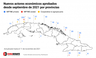 De acuerdo con datos ofrecidos por Alejandro Gil durante el II Foro Empresarial Cuba-2021, Cuba detuvo el decrecimiento sostenido del PIB de los dos años anteriores. Eso no quiere decir que se esté creciendo, solo indica que se había detenido, por ese período, la caída. El ministro ofreció datos esenciales sobre la mipymes y cuentapropistas. A finales de noviembre de 2021, 602,415 cubanos se encontraban registrados en esa fecha como trabajadores por cuenta propia. Las mujeres solo representan el 35% del total, lo cual pudiera indicar un persistente desbalance de género en acceso a mejores ingresos y capital para invertir. Hasta diciembre se habían creado más de 901 mipymes en el país, –865 privadas– y 406 cooperativas no agropecuarias. Las mipymes se han concentrado en actividades relacionadas con la producción manufacturera y de alimentos, y se estima que han generado más de 11,000 nuevos empleos. Esto último es crucial en el entorno que pudiera enfrentar la empresa estatal nacional.