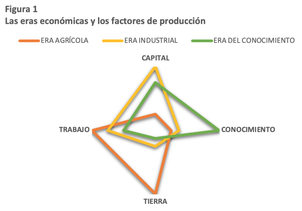 La época económica es trascendental para orientar los esfuerzos de desarrollo de un país. En la era agrícola, la población y la disponibilidad de tierra fueron elementos centrales del avance de las civilizaciones. Con la Revolución Industrial, el centro de gravedad se desplazó hacia el capital físico, específicamente las máquinas, y los sistemas de transporte para vincular la creciente producción con el consumo. En décadas recientes, se observa un desplazamiento hacia un modelo productivo donde la calificación de la fuerza de trabajo y las tecnologías de la información y las comunicaciones (TIC) son más prominentes (Figura 1). Se ha calculado que en el período 1995-2012, la mitad del crecimiento económico estadounidense se debe al trabajo especializado y el capital TIC (Jorgenson, 2018). Ello no implica que todos los países avanzan a la misma velocidad. El progreso tampoco es automático o espontáneo. Adecuarse a ese entorno es clave porque ahí se concentrará el desarrollo científico-técnico y emergerán los sectores más dinámicos.