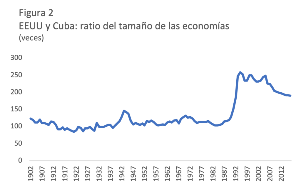Ningún país es una isla, económicamente hablando. Cuando menos, es incorrecto plantear que las trayectorias se explican casi exclusivamente por las políticas domésticas. Invocar la accidentada relación con Estados Unidos para justificar los males internos o incluso hacerlo su causa única no es un recurso nuevo en la historia de Cuba. Estados Unidos siempre ha sido el vecino más importante de Cuba, pero ha cambiado enormemente durante los últimos 200 años. La existencia de una enorme asimetría es bien conocida, aunque permanece poco documentada. Esa diferencia siempre ha operado a favor de Estados Unidos, y le ha servido para imponer ciertas decisiones a sus vecinos, no solo a Cuba. La magnitud de la misma es sobrecogedora, aunque no siempre se ha comportado igual, tal y como se observa en la Figura 2. La dinámica de esa brecha resulta reveladora para entender numerosos acontecimientos del siglo XX.