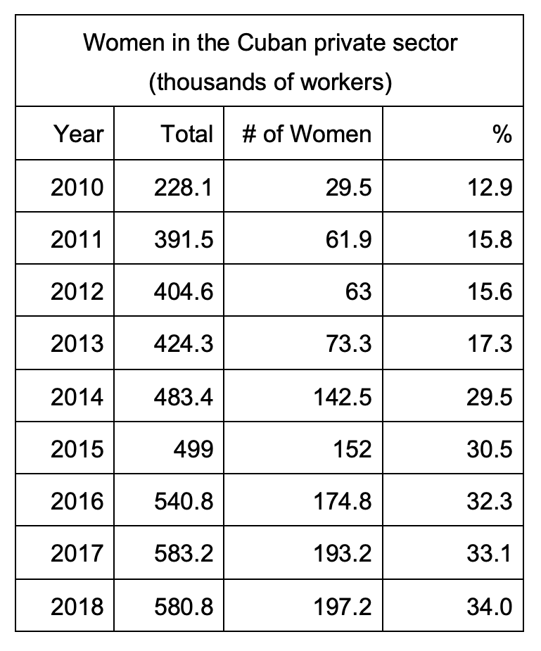 However, Cuban women represent only 33.9% of total cuentapropistas. Although their proportion within the total of self-employed workers increases every year, that number has never risen above 35%.
